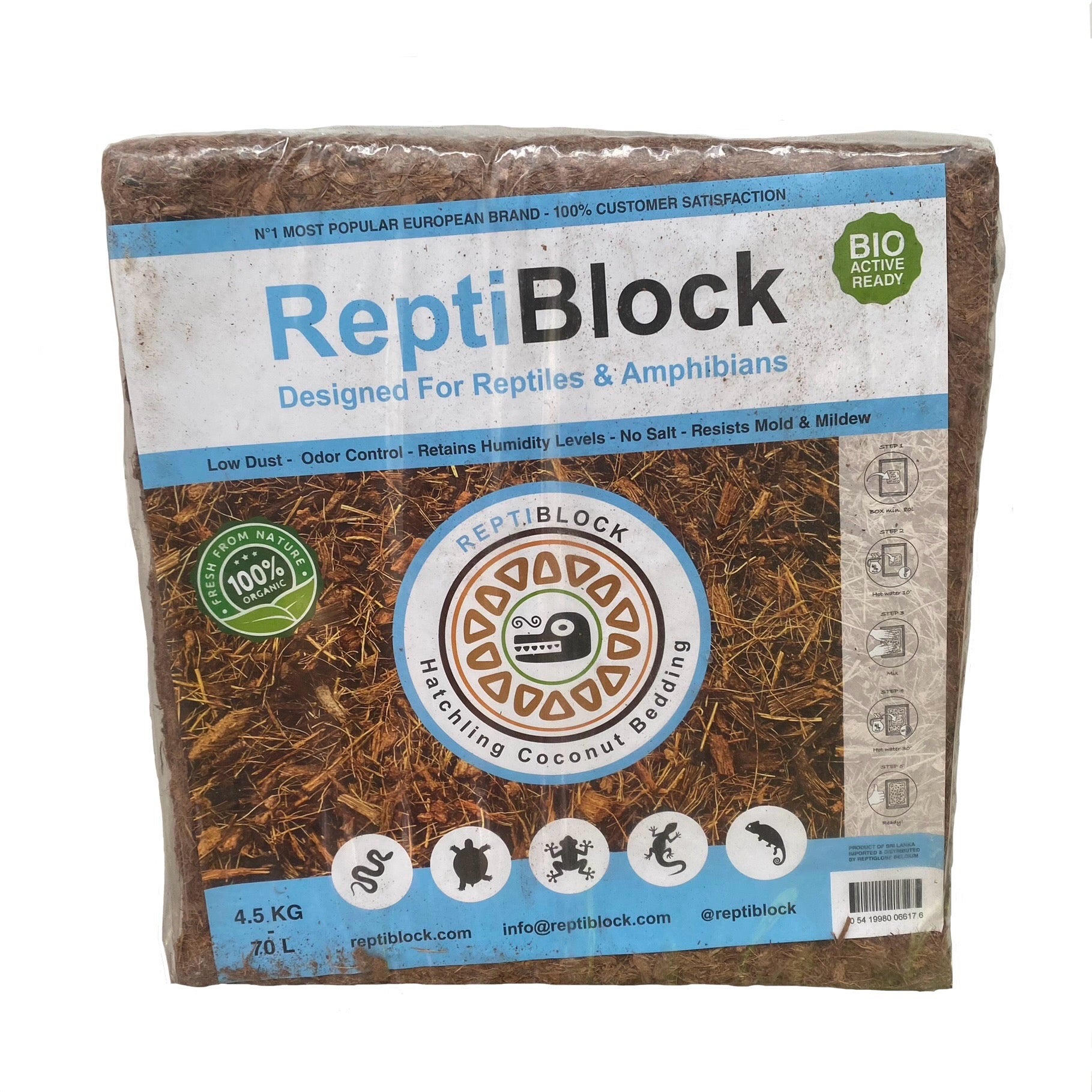 Reptiblock is coconut husk based substrate which has been dehydrated and compressed for easy storage. When rehydrated with water the dehydrated block will expand and create 70L worth of coconut fibre substrate.