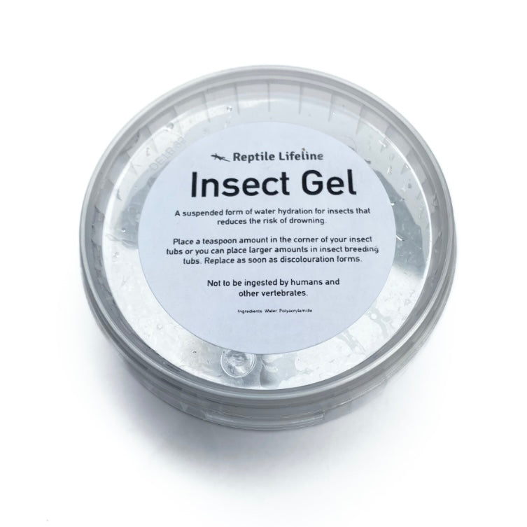 This gel is a suspended water form designed to be placed into the insect containers and insect breeding tubs to provide hydration without the risk of drowning. Instead they are able to stand on top of the gel and drink without sinking in and dying!